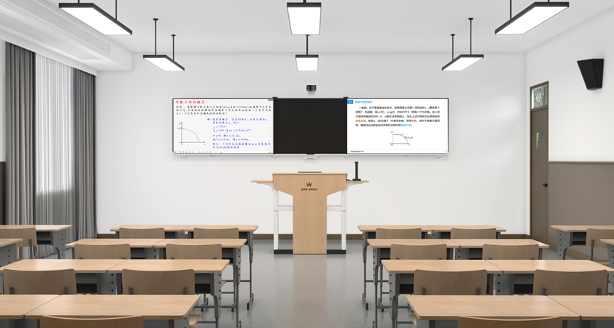 从 90 年代的投影机,到电子白板,再到如今的一体机,智慧教室的形态几经更迭。无论技术如何更新,理想的装备都应助力教师回归C位,配合双大屏幕公平照顾左右两侧学生,面对学生精细化板书,轻声授课,呵护师生健康。